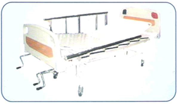 Frame work of rectangular CRC tubes mounted on 10cms dia swivelling castors two with brackes. 18 G Perforated CRCA sheet top in three sections. Back section, leg section, and height position adjustable by three seprate screws from foot end. Removable Blow Molded ABS head and foot panels. Collapsible safelty side railings at both sides. |