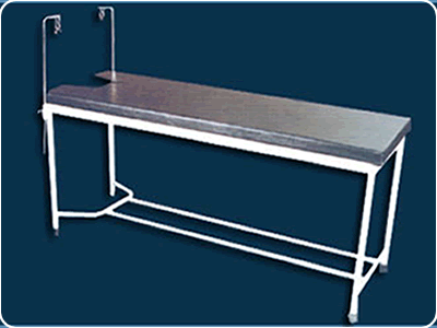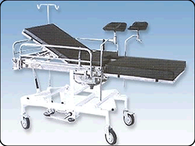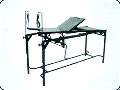 Tubular Steel frame top sheet S.S. It has also a manually operated backrest semi-circle cut at bottom end to adjustable trendleburg positions on strong screw mechanism system fitted with a pair of Chrome plated lithotomy leg support & locking traction handle at side with adjustable sailine rod w/out mattress